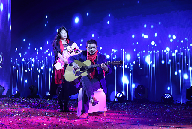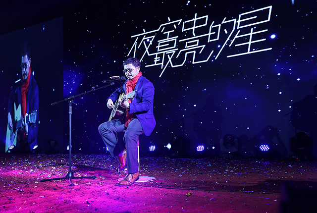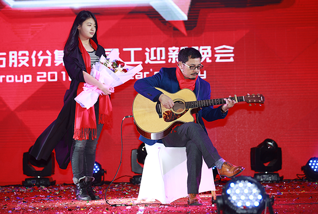 受現(xiàn)場(chǎng)氣氛感染,唐董也攜吉他登臺(tái),即興彈唱了《夜空中最亮的星》、《當(dāng)你老了》,鼓舞棟方股份集團(tuán)的奮斗者們,在新的一年勇敢前行。