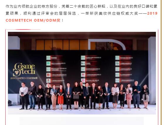 祝賀棟方股份榮獲全球美妝供應(yīng)鏈權(quán)威大獎(jiǎng)——2019 COSMETECH OEM/ODM獎(jiǎng)
